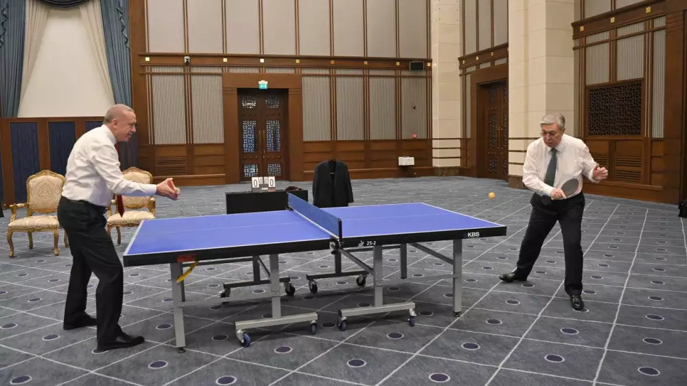Президент Казахстана Касым-Жомарт Токаев и Президент Турции Реджеп Тайип Эрдоган сыграли партию в настольный теннис по окончании официальных мероприятий, передает Tengrinews.kz.