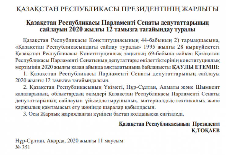 "Назначить на 12 августа 2020 года выборы депутатов Сената Парламента Республики Казахстан", - говорится в тексте указа, опубликованном в государственных СМИ.