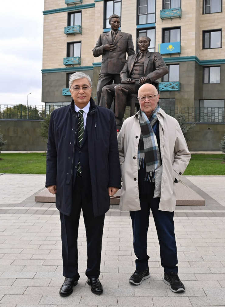 Президент открыл памятник Мухтару Ауэзову и Кайыму Мухамедханову "Ұстаз бен шәкірт" в Семее, передает корреспондент Tengrinews.kz.