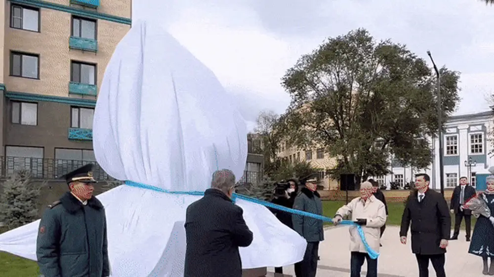 "Выполненная из бронзы скульптурная композиция установлена на гранитный постамент. Общая высота монумента составляет четыре метра. Памятник был сооружен за счет спонсорских средств", - отмечает пресс-служба Главы государства.