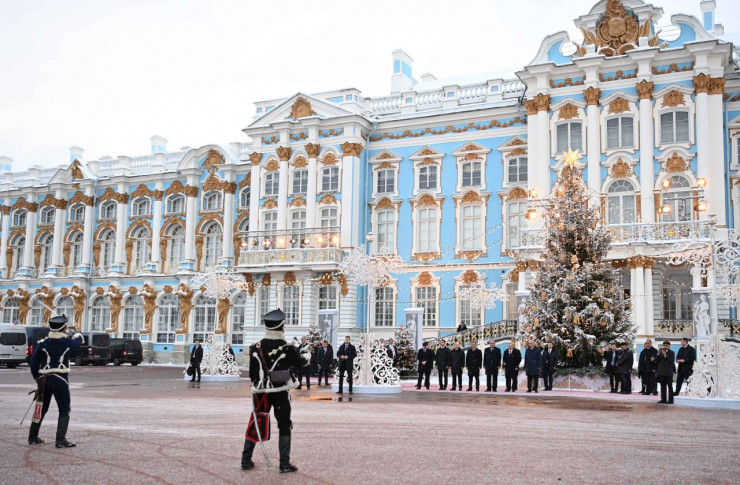 Затем главы государств посетили музей-заповедник "Царское село" и осмотрели залы Екатерининского дворца. Царскосельский дворцово-парковый ансамбль – признанный шедевр архитектуры и садово-паркового искусства XVIII – начала XX веков. Бывшая летняя резиденция российских императоров – это один их самых посещаемых музеев России, который в 2022 году посетили 2,9 миллиона человек. В Екатерининском дворце, который является центральным объектом Царского села, находится легендарная Янтарная комната.
