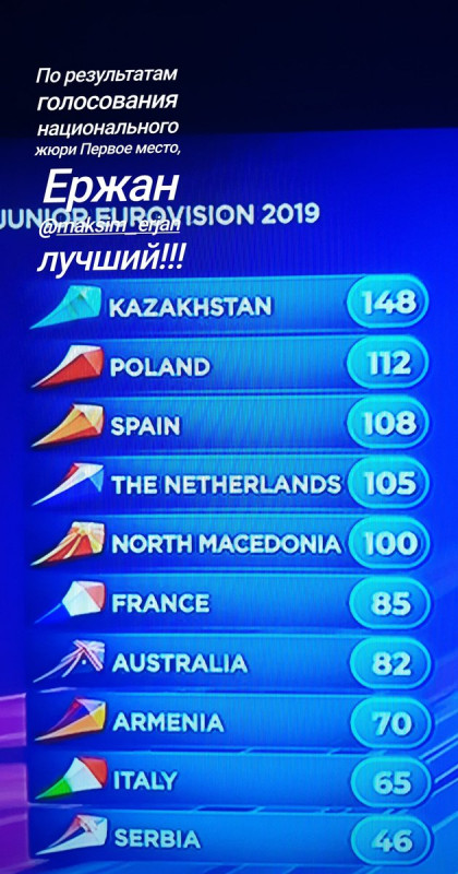 Финал Junior Eurovision 2019 состоялся в воскресенье, 24 ноября, в польском Гливице. Представитель Казахстана Ержан Максим занял второе место, набрав по итогам голосования профессионального жюри и зрителей 227 баллов (причем по результатам голосования национального жюри казахстанцу досталась первая строчка).