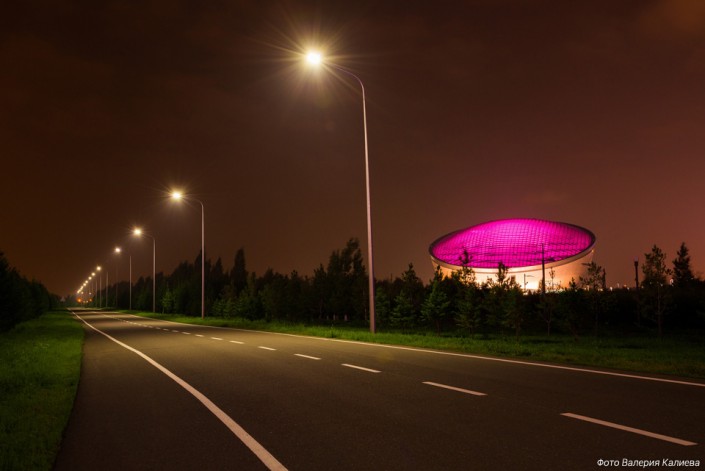 "Назарбаев центр". Ночная подсветка напоминает иноземное происхождение объекта, словно летающая тарелка накрыла Есиль. Техническая уникальность данного сооружения заключается в особой конструкции кровли, благодаря которой диаметр пролета достигает 81 метра. Уникальная подсветка здания "Назарбаев центра" состоит из светодиодных прожекторов заливного света, которые установлены внутри здания и направлены на стеклянную крышу.