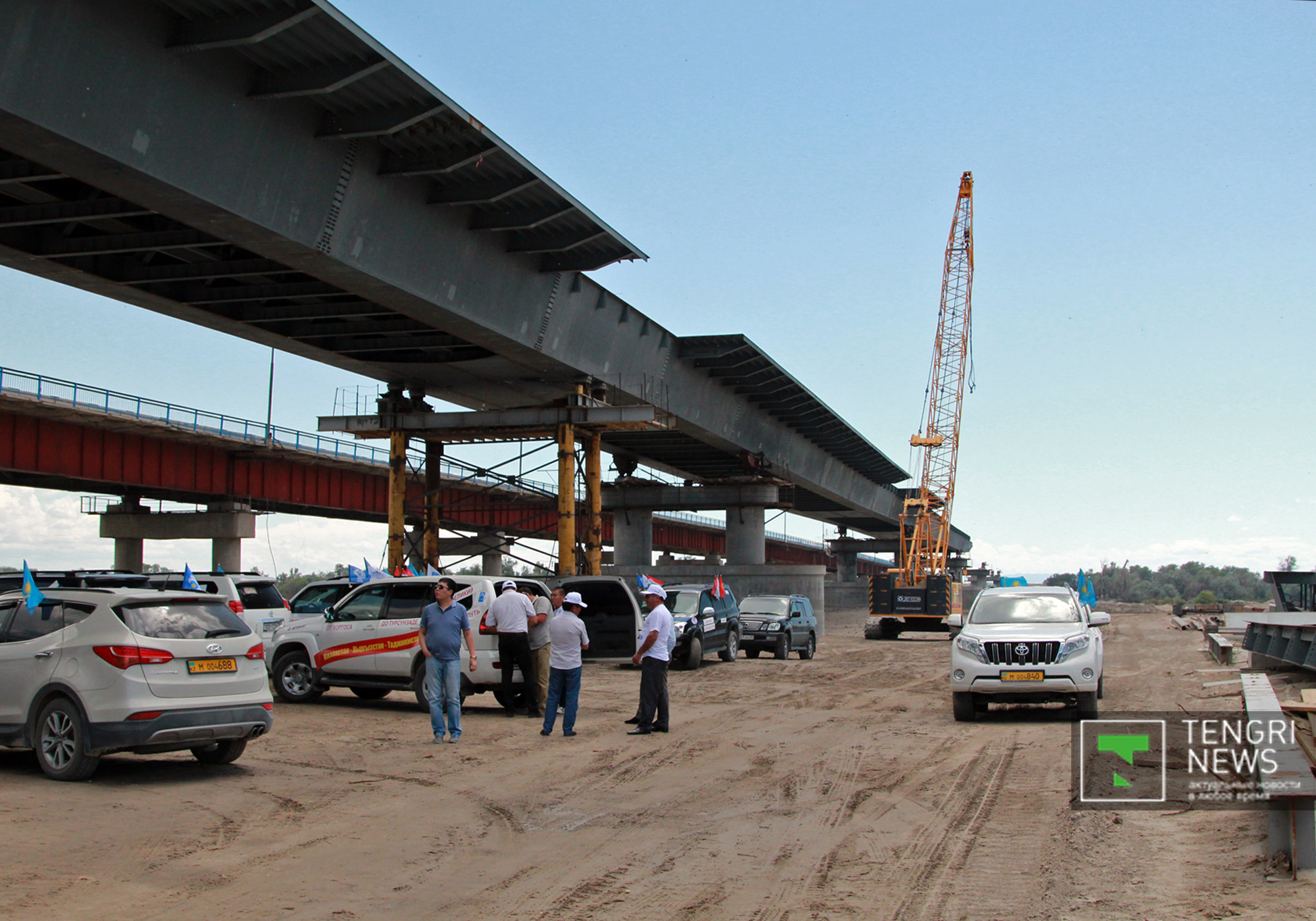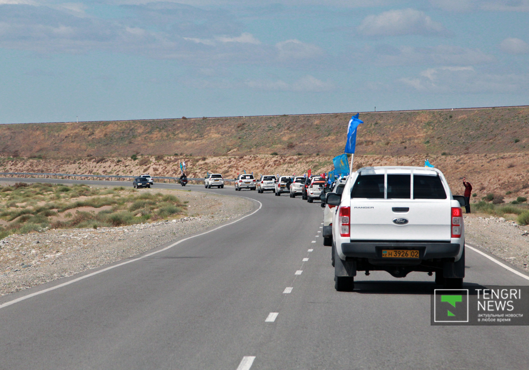 Участники автопробега останавливались на разных участках трассы Алматы - Хоргос и смотрели на ход строительства.