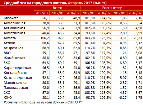 Самые высокие средние чеки зафиксированы в Алматы (106,2 тысячи тенге, +3,3 тысячи тенге к январю), и в Атырауской области (68,9 тысячи тенге на горожанина, +8,8 тенге за месяц).