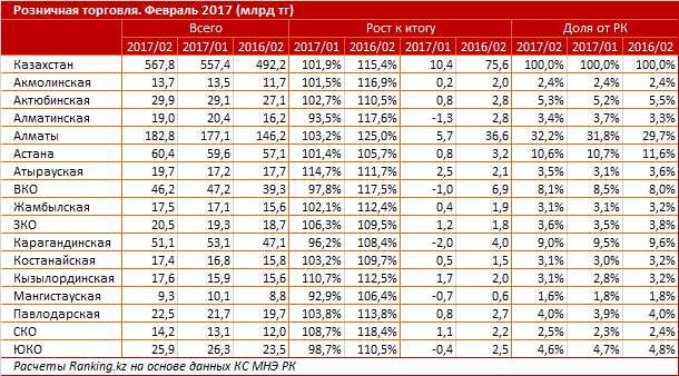 Доля мегаполисов от всех розничных продаж по стране продолжает расти: 42,8 процента в феврале 2017 года, против 42,5 процента месяцем ранее и 41,3 процента год назад.