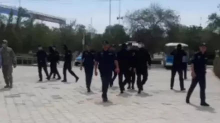 "К акимату Жанаозена подогнали полицейских и СОБР, по словам автора видео, силовики собираются задержать участников акции - безработных. Безработные жители Жанаозена почти два месяца пикетируют акимат города, требуют дать работу", - говорится в подписи к видео.