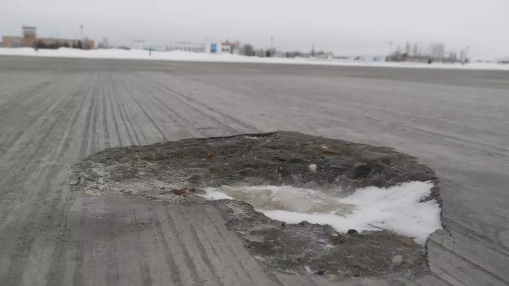 Трещины появились на новой взлетно-посадочной полосе аэропорта Уральска Выбоина в покрытии взлетно-посадочной полосы. Фото предоставлено аэропортом Уральска.