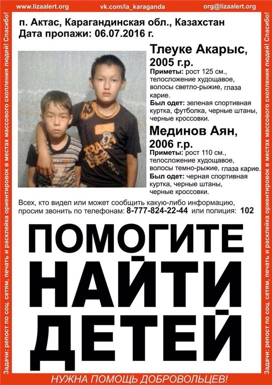 Мальчики, 11-летний Акарыс Тлеуке и 10-летний Аян Мединов, пропали 6 июля в поселке Актас, Карагандинской области. По информации волонтеров, в полицию заявление о  пропаже детей подал отец. Ребята играли и ушли со двора в первой половине дня. После этого их никто не видел.
