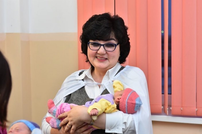 Аким города поздравил маму малышей и вручил подарки - комплекты со всеми необходимыми предметами для новорожденных.