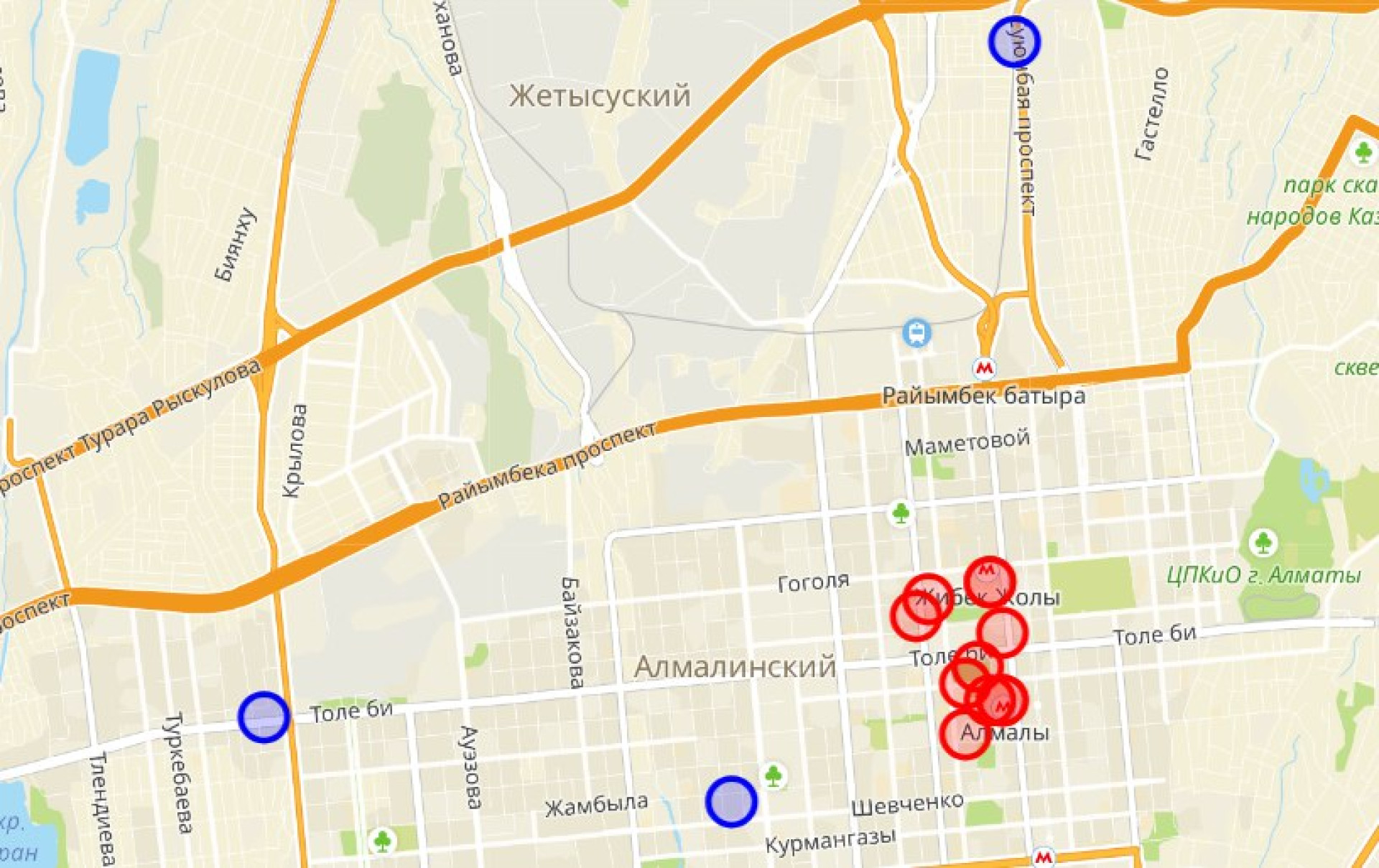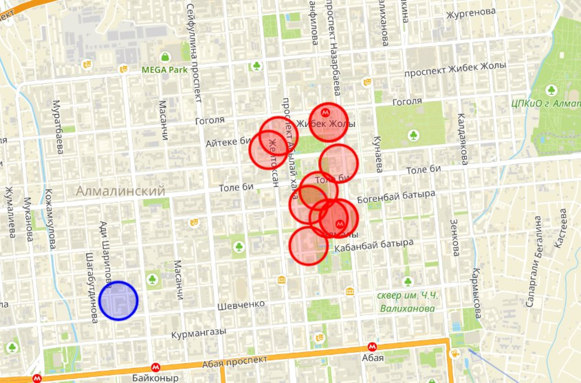 - Алмалинский район: район улиц Толе би, Аренского, Дуйсенова и Аносова.