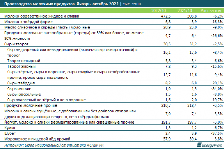 В натуральном выражении выпуск обработанного жидкого молока и сливок сократился на 6,2 процента, до 472,5 тысячи тонн, сливочного масла и спредов - на 9 процентов, до 20,9 тысычи тонн, молочных пастообразных спредов - на 26,6 процента, до 4,7 тысячи тонн, сыра и творога - на 2,5 процента, до 30,5 тысячи тонн, сгущенных молока и сливок - на 5,5 процента, до 7 тысяч тонн, йогурта - на 3 процента, до 191,7 тысячи тонн, шубата - на 37,5 процента, до 2,4 тысячи тонн.