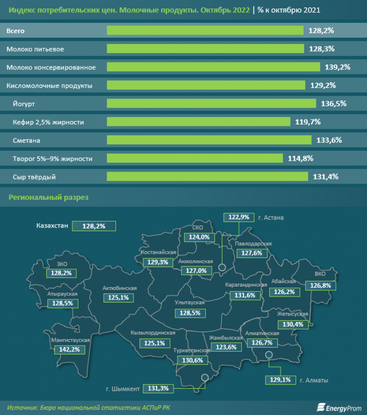 В региональном разрезе рост цен на молочные продукты питания сильнее всего ощутили жители Мангистауской области: плюс 42,2 процента за год. В тройке антилидеров также оказались Карагандинская область (плюс 31,6 процента) и Шымкент (плюс 31,3 процента).