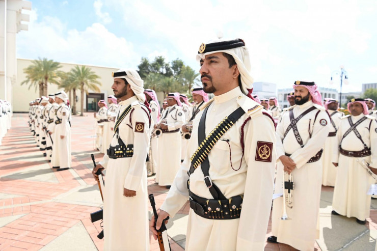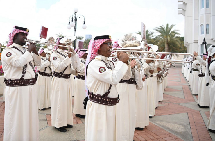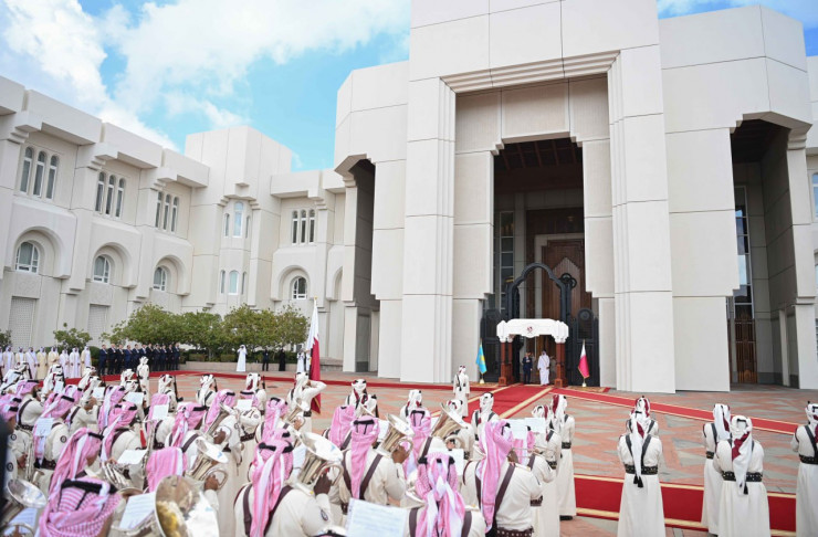 После исполнения гимнов Казахстана и Катара Касым-Жомарт Токаев и шейх Тамим бен Хамад Аль Тани представили друг другу членов официальных делегаций