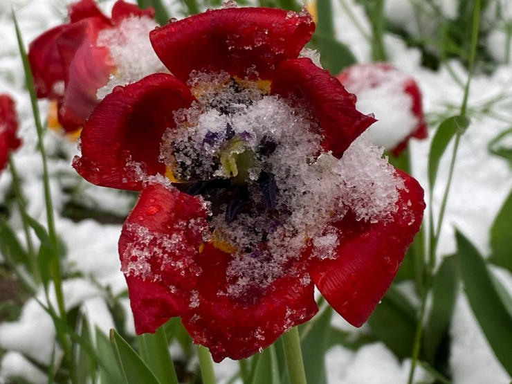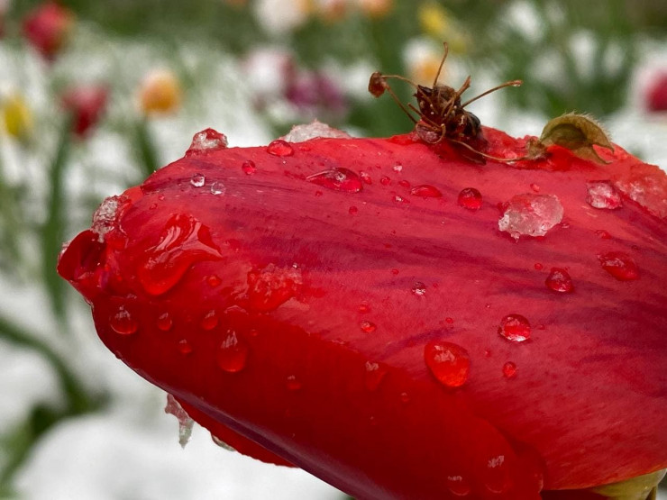 Живописные картины образовались на городских клумбах. Удивительно, но тюльпаны держатся под таким тяжелым и холодным грузом.