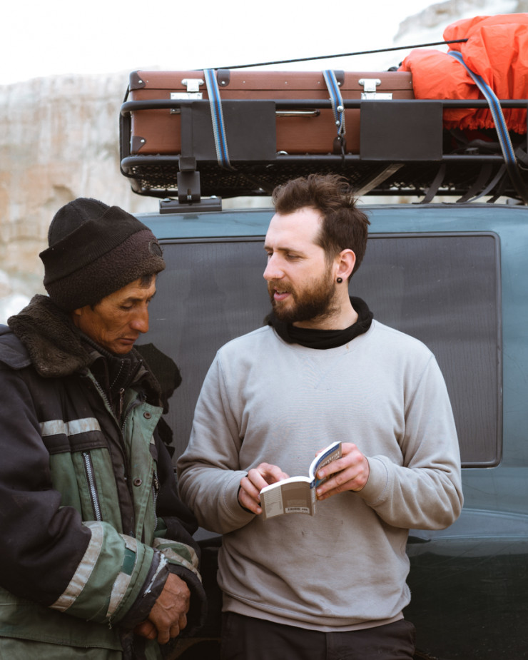 Братья Натан и Алекс едут на своем автомобиле для приключений "Каспар" по самой высокой дороге в горах Памира