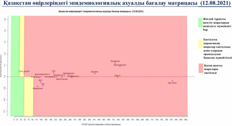 Согласно матрице оценки эпидемиологической ситуации на 12 августа, регионы Казахстана расположились следующим образом:
