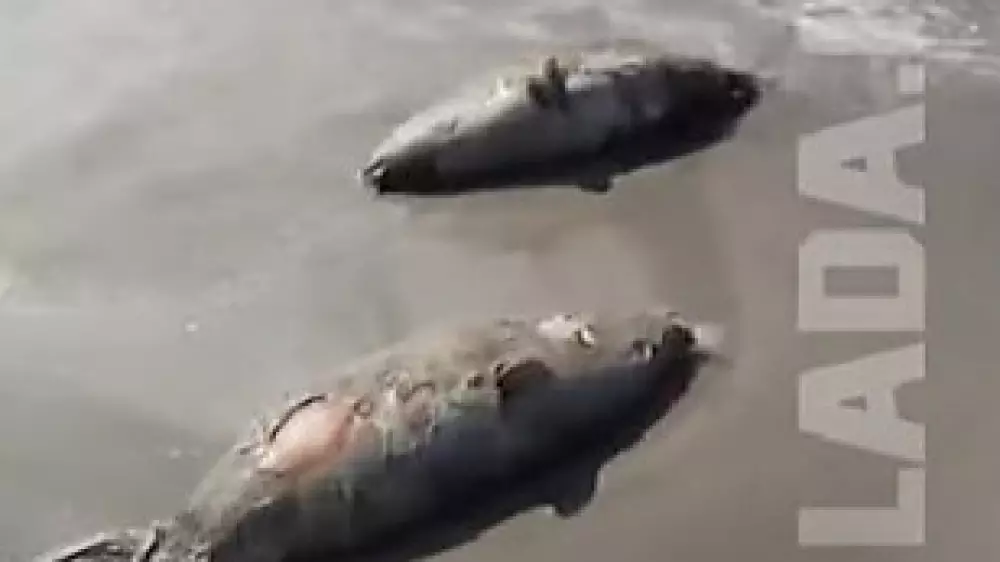По словам автора видео, туши выбросило на берег в течение получаса. На кадрах видно, что у одной из туш местами ободрана шкура.