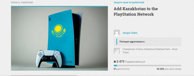 Казахстанцы продолжают бороться за признание компанией Sony Казахстана в качестве отдельного региона и открытия доступа для граждан страны к цифровым сервисам PlayStation Network, включая онлайн-магазин игр. Автором новой инициативы стал специалист по корпоративным коммуникациям Сергей Чикин. Он разместил петицию, адресованную лично президенту корпорации Sony Хироки Тотоки (на момент создания петиции глава игрового подразделения корпорации Sony Interactive Entertainment), на европейской платформе openPetition 16 января, и за почти месяц ее подписали более 2300 пользователей и еще более 1000 оставили свои комментарии. Цель петиции - собрать 50 тысяч подписей.