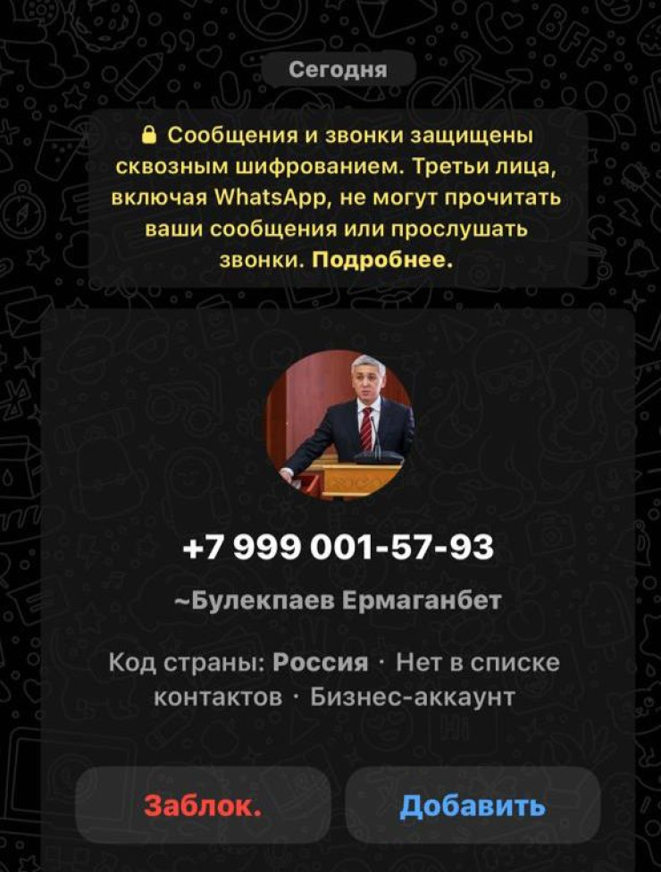 В WhatsApp появился поддельный аккаунт акима Карагандинской области Ермаганбета Булекбаева, с которого была запущена рассылка с просьбой о финансовой помощи, передает Tengrinews.kz со ссылкой на stopfake.kz.