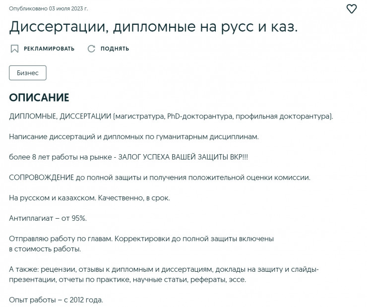 К сведению вице-министра публикуем несколько объявлений, которые нашлись на одном популярном сайте частных объявлений. Как следует из их содержания, некоторые предлагают подобные услуги не первый год. Интересно и то, что исполнители гарантируют прохождение упомянутой выше проверки на плагиат.