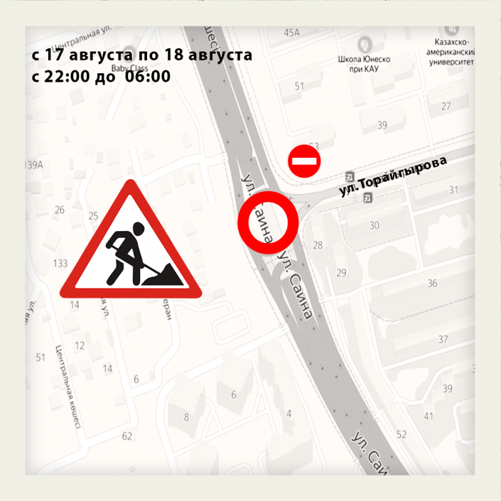 Также 17 августа с 22:00 по 6:00 18 августа ограничат движение по улице Торайгырова на участке транспортной развязки улицы Саина и улицы Торайгырова.