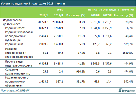 В первом полугодии издательские услуги составили 20,7 миллиарда тенге - на 4,6 процента больше, чем годом ранее.