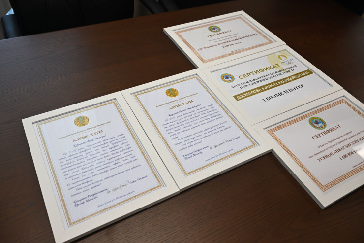 Бейбут Шаханов также вручил Камиле Досмаловой денежный сертификат на сумму в 2 миллиона тенге, а Анвару Усенову — сертификат на 1,5 миллиона тенге. Кроме того, спортсменке предоставили служебное жилье.