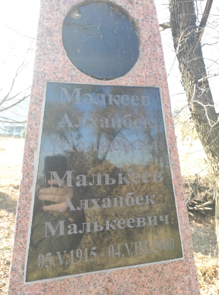 "Кто был в Талгаре, тот видел, что при въезде в город с правой стороны находится колледж, на территории которого стоит стела, а рядом с ней - две трехдюймовые пехотные пушки. Недалеко от них с правой стороны расположен неухоженный, заросший сухостоем и деревьями памятник видному государственному и общественному деятелю Алханбеку Малькееву, именем которого названы улицы и государственные учреждения.
