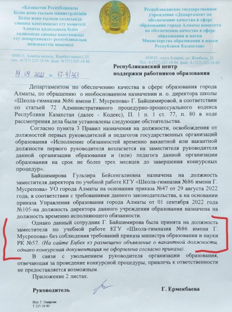 "Управление образования нарушило приказ министра образования № 57: никакого конкурса на прием не проводилось. Коллектив школы увидел Байшимирову лишь 6 сентября. Возникает вопрос: как она была принята на работу, если весь коллектив, включая делопроизводителя, не видел и не слышал об этом. Данное нарушение выявлено также Департаментом по обеспечению качества в сфере образования Алматы", - подчеркнули они.