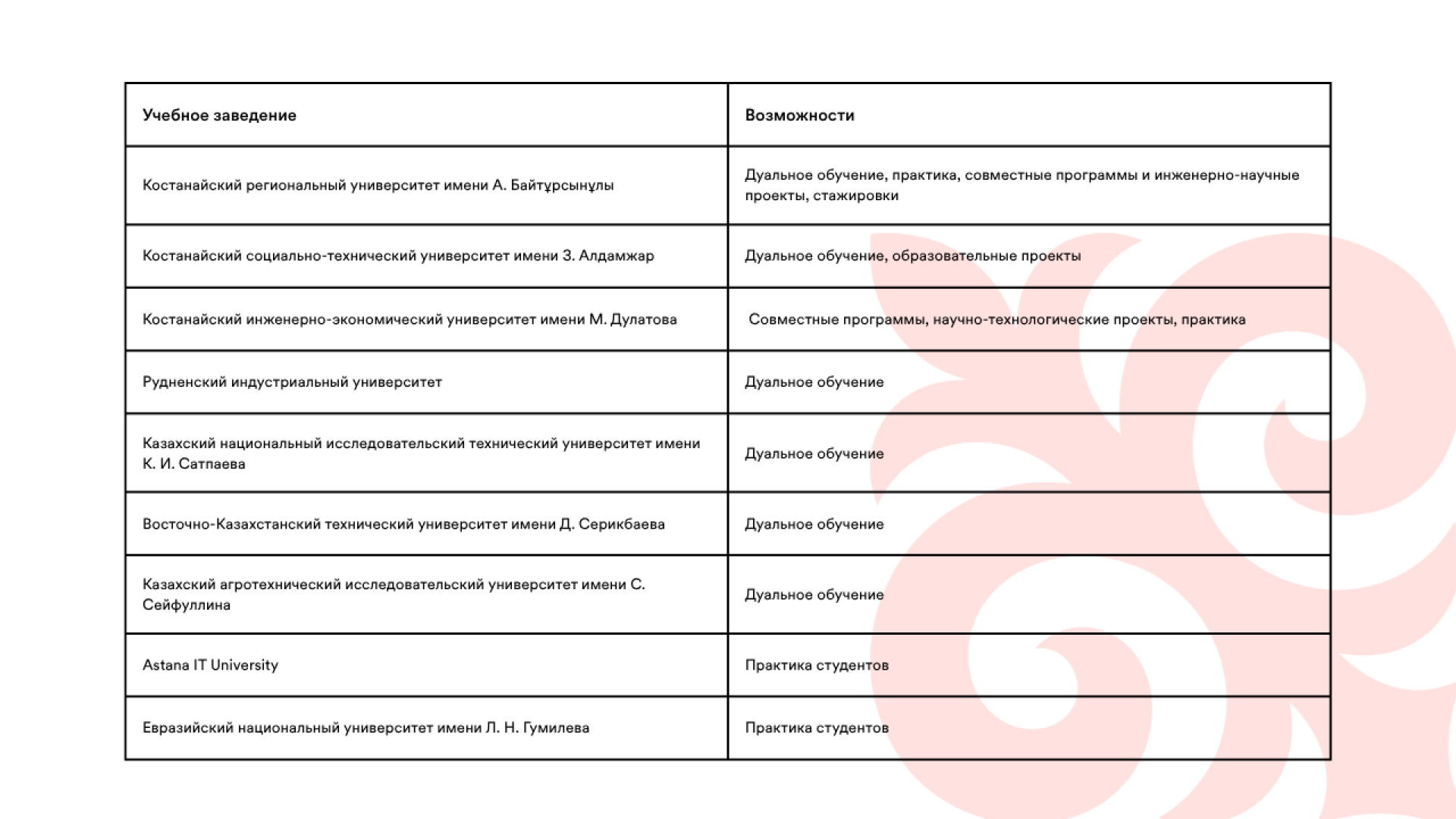 Как отмечают в компании, в этих условиях профессия машиностроителя приобретает особую актуальность для молодежи, которая рассматривает быстрый выход на рынок труда. В Казахстане действует ряд учебных заведений, ориентированных на подготовку кадров для машиностроительной отрасли. Среди которых 7 колледжей Костанайского региона и 8 республиканских колледжей входят в единую систему дуального обучения Allur. А также 5 региональных, 10 республиканских, 2 национальных и 5 зарубежных вузов являются основными партнерами предприятия.
