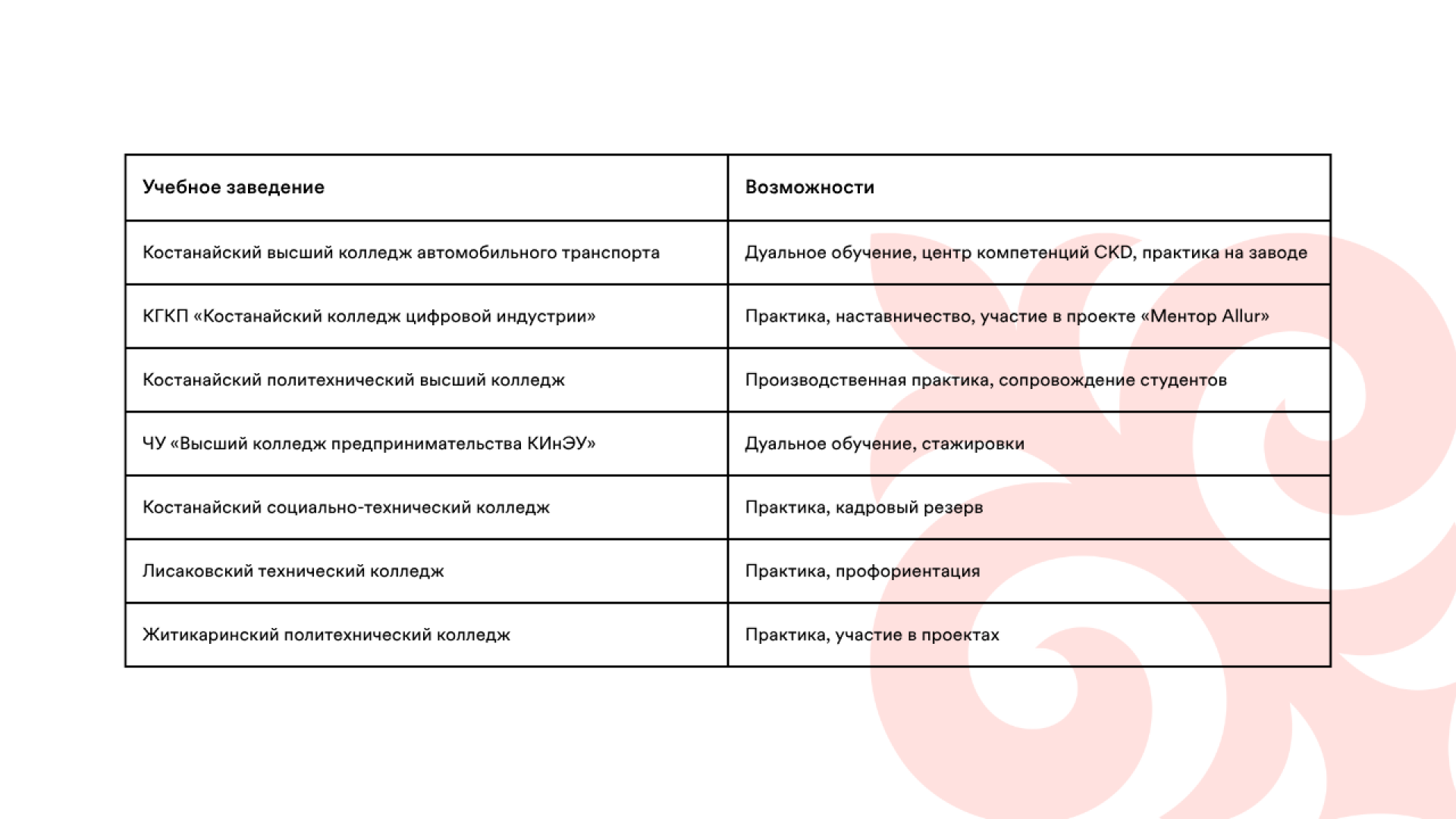 В этой системе, по информации компании, важную роль играет участие бизнеса. Крупные промышленные предприятия Казахстана инвестируют в развитие кадрового потенциала, формируя устойчивую экосистему взаимодействия с образовательными учреждениями. Одним из активных участников этого процесса является Allur – один из ведущих автопроизводителей страны. Компания заинтересована в подготовке специалистов, обладающих современными компетенциями, и поддерживает инициативы, направленные на развитие технического образования и практико-ориентированного обучения.