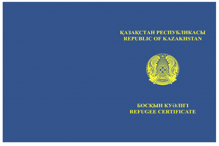 На внешней стороне передней обложки удостоверения беженца размещена надпись на казахском и английском языках: