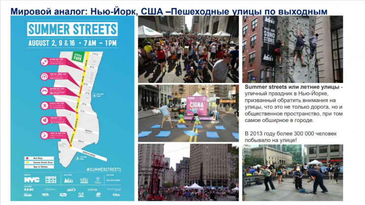 Они убеждены, что ретейл и бизнес должны развиваться на улицах. Данный подход побуждает население перемещаться пешком, тем самым быть активными и здоровыми. Сегодня во всем мире это уже реабилитационная мера. Нам, в свою очередь, необходимо развивать предпринимательские улицы в городе, где будут качественные услуги и товары. Создавать причины для променада на улице. Необходимо адаптировать улицы к требованиям нового времени и создать на наших улицах активность", - сказал директор Центра урбанистики.