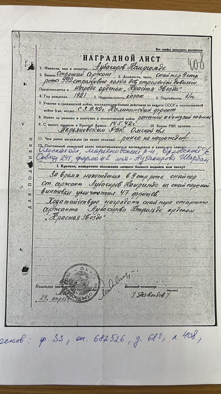 "За время нахождения в 9-й стрелковой роте снайпер старший сержант Аубакиров Каиргельды из снайперской винтовки уничтожил 47 фрицев", - говорится в наградном листе.