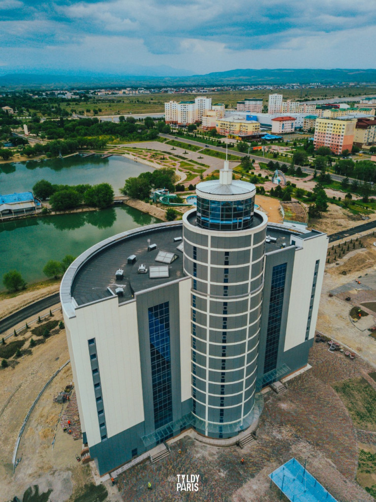 На девяти уровнях современного талдыкорганского общежития расположено 96 жилых комнат, библиотека, студенческий клуб, кафе, компьютерные комнаты, мини-кинотеатр и несколько смотровых площадок. Из окон достаточно сложного и красивого архитектурного объекта открывается отличный вид на городское озеро, где в летний период работает подсвечиваемый фонтан и имеется набережная.