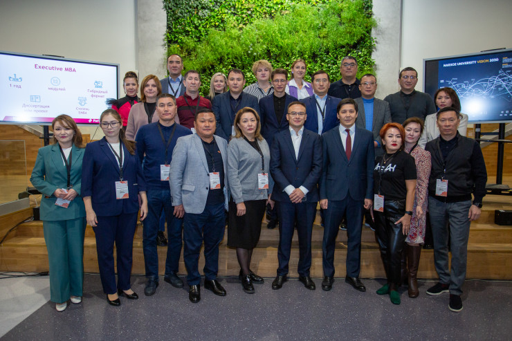 Председатель правления АО "ForteBank" Бекжан Пирматов, Провост Университета Нархоз Ерлан Шуланов с участниками программы Executive MBA. Фото из архива пресс-службы университета