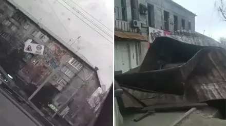 На углу улиц Татибекова и Колпаковского ветром снесло металлическое покрытие крыши, которое упало на припаркованные возле здания машины.