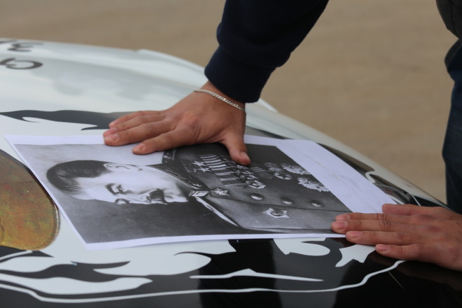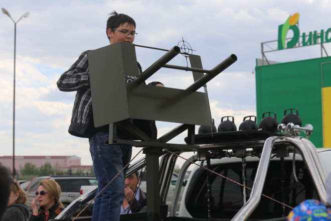 9 мая участники автопробега собрались на стоянке возле торгового центра "Дина". Все машины были разукрашены военной символикой и флагами СССР, на многих имелись надписи "Спасибо деду за победу", "На Берлин", "Помним и гордимся!", "За Сталина!", "Спасибо бабуле за меткие пули" и прочие. Водители были одеты в гимнастерки, пилотки военного времени.