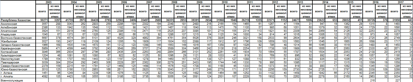 При этом число осужденных по Алматы за 10 лет снизилось. В 2003 году было осуждено 4 582 человека, в 2007-м - 3 736, в 2010-м - 2 501, в 2011-м - 2 228, в 2015-м - 2 160, в 2017-м - 3 034.