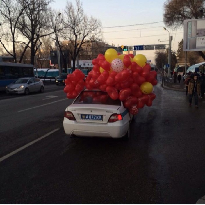 Пользователи социальных сетей обсуждают фото, которое было снято на пересечении проспектов Абая и Достык. На кадре запечатлен автомобиль правоохранительных органов, который перевозит гелиевые шары. У машины четко виден государственный регистрационный номерной знак, закрепленный за автомобилями Департамента внутренних дел Алматы.