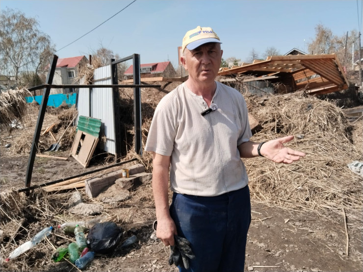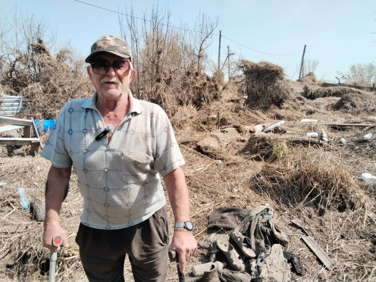 "Вот такую чурку огромную паводок принес, ее бы бензопилой, да завел ее, а она намокла и не работает. А камыша сколько… Тут спичку кинь, все сгорит. Мы лишились всего, да и остатки может испепелить огонь, не дай бог. Бабка с осени убиралась, а толку-то. Пройти не могу, бадик (трость для ходьбы) проваливается. Нет помощников. Вот кто мне поможет? Бабушка еле ходит, давление упало вообще, как увидела это все", - говорит пожилой мужчина.