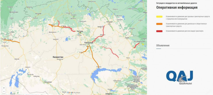 "По состоянию на 19:00 в девяти областях в связи с ухудшением погодных условий введено временное ограничение движения на 18 участках автодорог республиканского значения. Дороги закрыты в Абайской, Акмолинской, Актюбинской, Восточно-Казахстанской, Карагандинской, Костанайской, Северо-Казахстанской, Улытауской и Павлодарской областях. В снегоочистительных работах задействовано 400 единиц спецтехники и 500 человек", - говорится в сообщении.