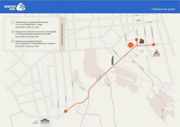Как рассказали в акимате города, 25 февраля в связи с проведением городского забега Winter Run 2024 будет перекрыто движение по северной стороне проспекта Аль-Фараби от бульвара Мендикулова до Esentai Mall с 07:50 до 10:45, с 08:30 до 10:30 по проспекту Аль-Фараби от Esentai Mall до проспекта Гагарина.