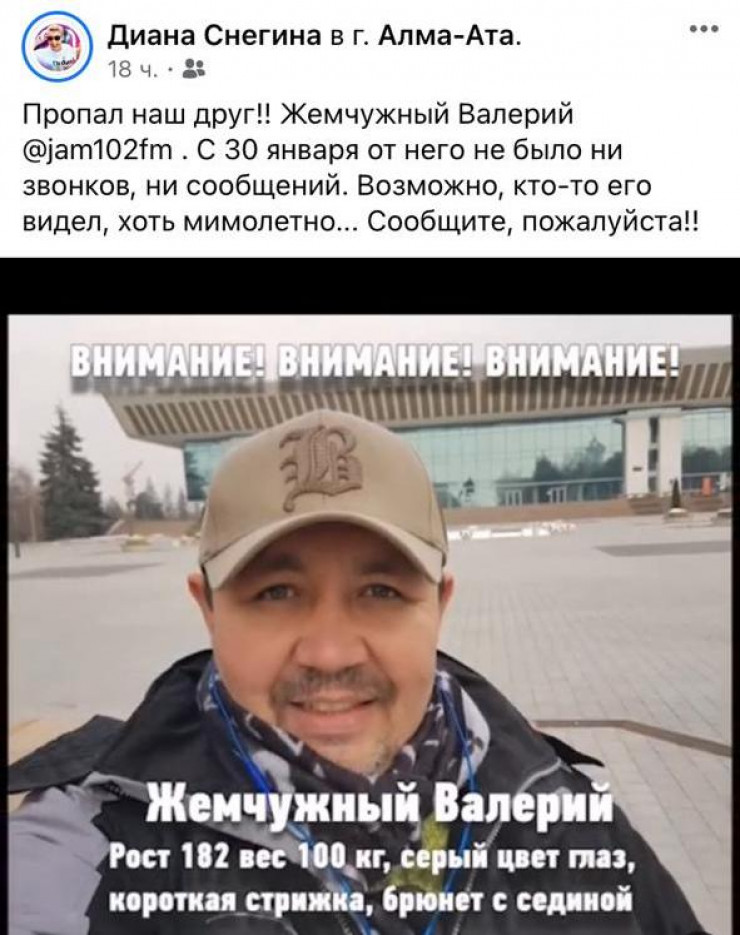 В полиции Алматы сообщили, что заявление о пропаже Валерия Жемчужного поступило 3 февраля. В правоохранительные органы обратилась его мать.