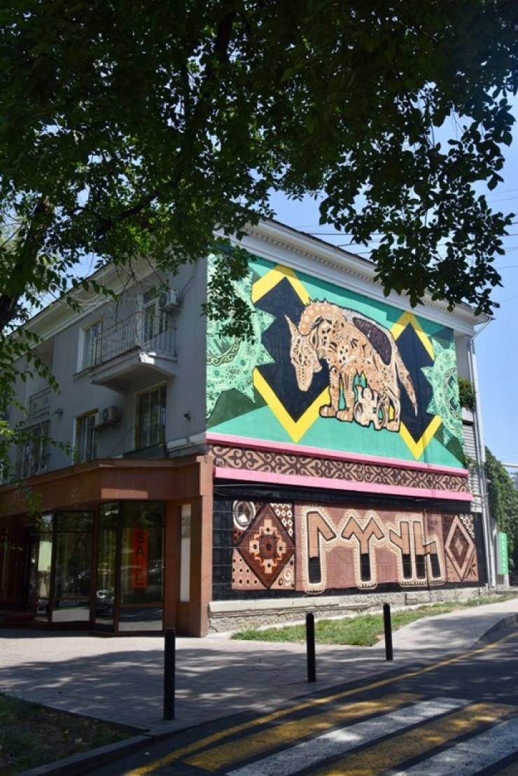 Мурал был расположен на фасаде трехэтажного здания на углу улиц Назарбаева - Богенбай батыра.