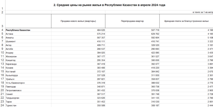 Бюро национальной статистики опубликовало средние цены на рынке жилья в Казахстане в апреле этого года. Бюро выпустило электронную таблицу, в которой также отражены индексы цен, передает корреспондент Tengrinews.kz.
