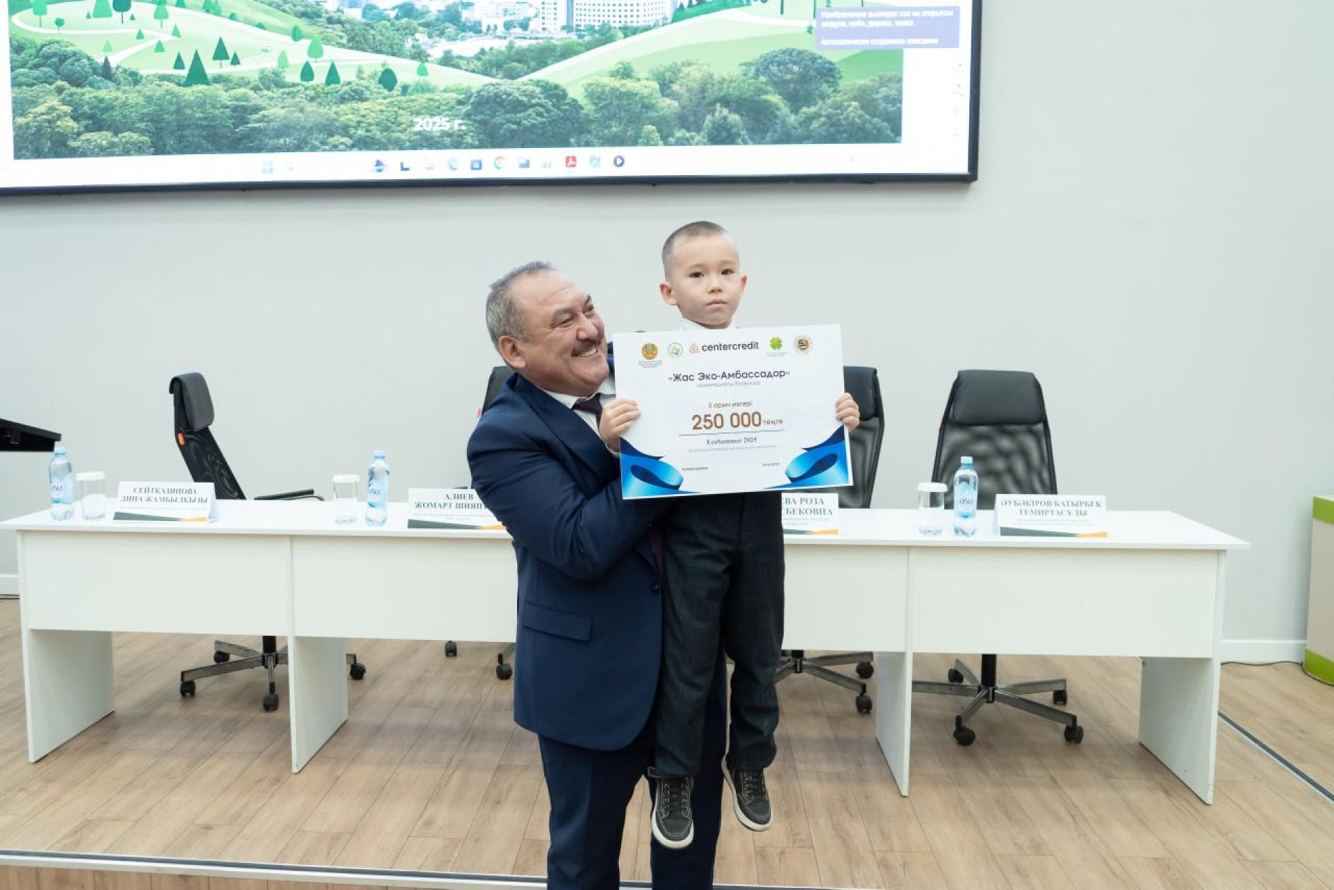 В церемонии награждения приняли участие вице-министр экологии и природных ресурсов РК Жомарт Алиев, председатель правления АО "Жасыл даму" Ержан Сәрсенбай, директор филиала Банка ЦентрКредит Дина Сейтказинова, а также проректор по академическим вопросам Роза Абишева и председатель Ассоциации переработчиков вторичного сырья Казахстана Батырбек Аубакиров.