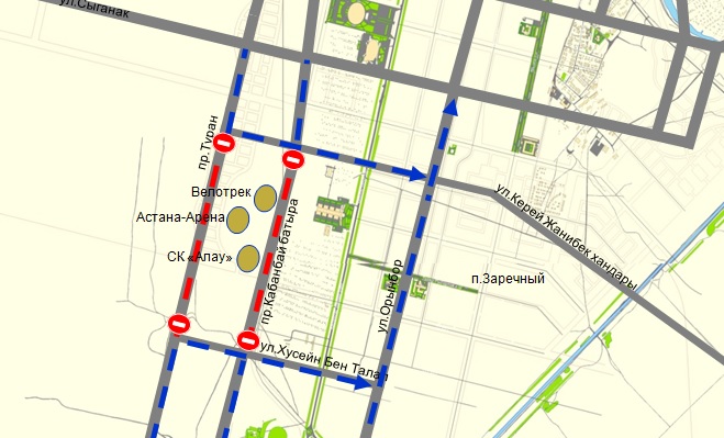 18 августа в 20.00 на стадионе "Астана Арена" состоится футбольный матч плей-офф Лиги Европы УЕФА между командами "Астана" и белорусским БАТЭ. В связи с этим, по данным ведомства, 18 августа с 18.00 будет ограничено движение транспорта по проспектам Кабанбай батыра и Туран на участке от улицы Керей Жанибек хандары до улицы Хусейн Бен Талал. "Запрет будет действовать вплоть до окончания мероприятия. Рекомендуемый маршрут объезда - по улице Орынбор", - уточняют в ДВД.