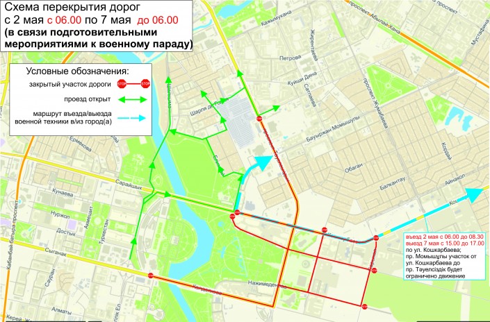 9 мая по случаю празднования Дня Победы в Великой Отечественной войне 1941-1945 годов в период с 9.00 часов до 13.00 часов будет ограничено движение на участке прохождения пешей и механизированной колонны "Бессмертный полк" по проспекту Тәуелсіздік от улицы Калдаякова до улицы Пушкина.